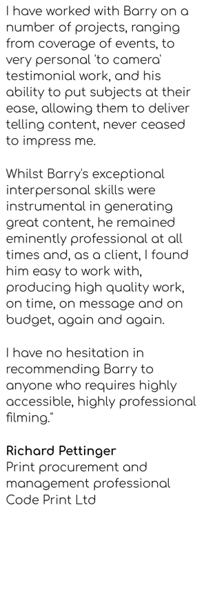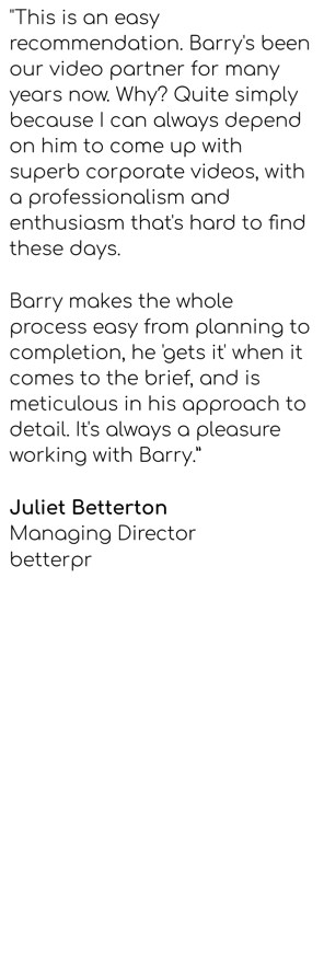 I am an award-winning corporate videographer and editor who specialises in turning real life situations into compelling content. I work with businesses and public sector organisations as well as PR and marketing agency partners in the Midlands and all over the UK. I also produce life story videos: